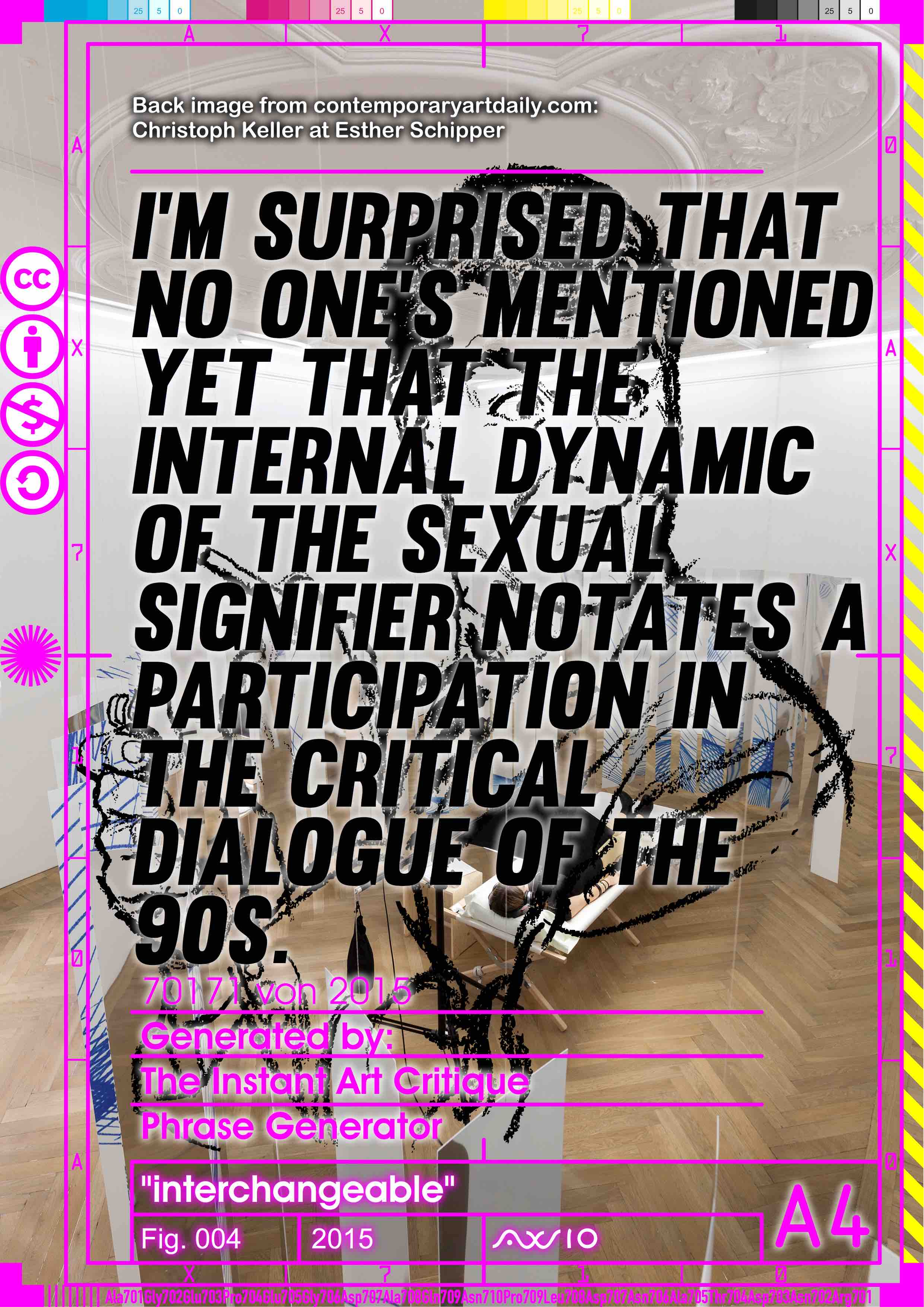 Statement generated by: The Instant Art Critique Phrase Generator and back image from comtemporarydaily.com: Christoph Keller at Esther Schipper.