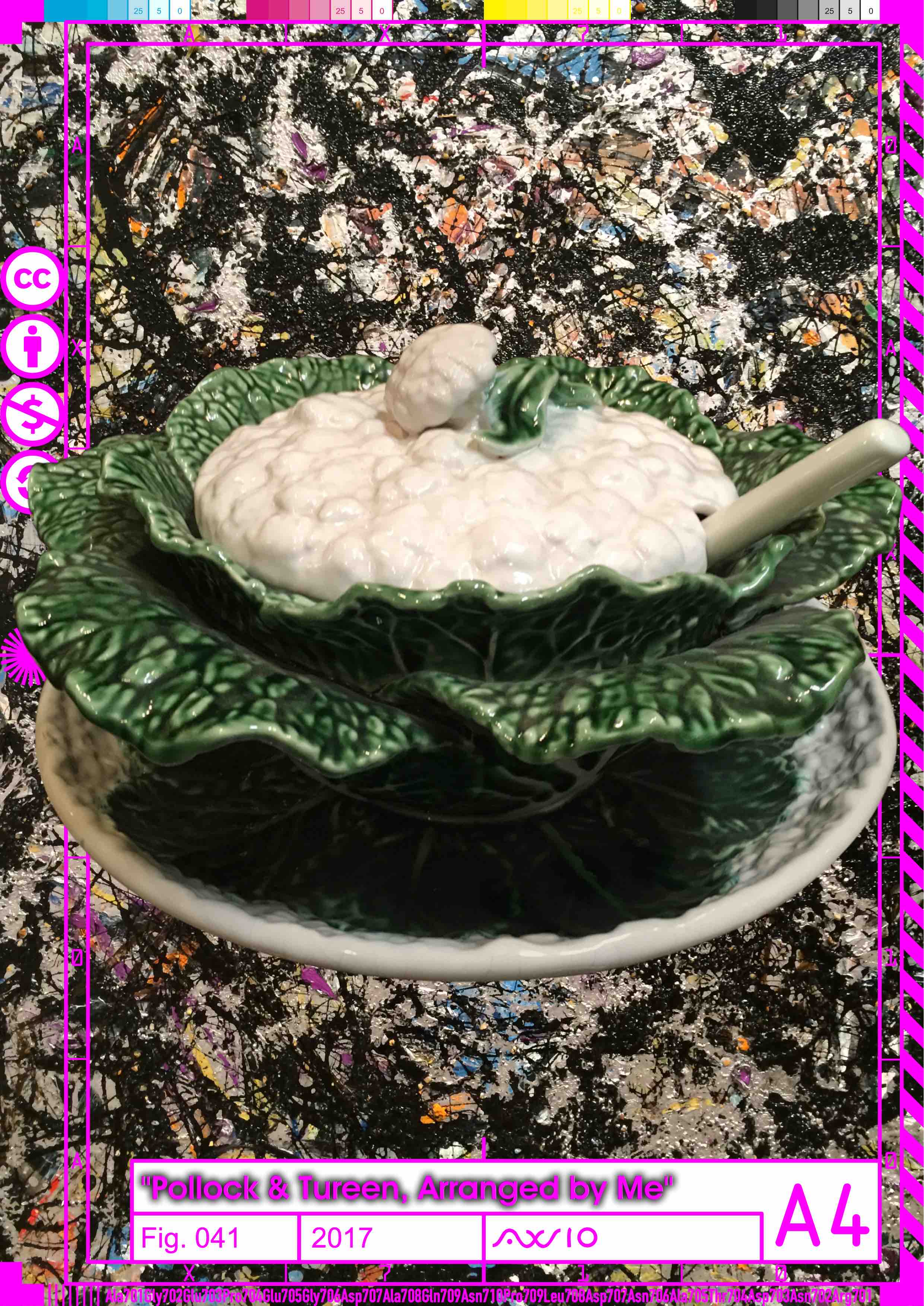 Remax on the work: Pollock and Tureen, Arranged by Mr. and Mrs. Burton Tremaine, Connecticut / Artist: Louise Lawler (American, born Bronxville, New York, 1947) / Date: 1984 / Medium: Silver dye bleach print / Dimensions: 71.1 x 99.1cm (28 x 39in.) / Frame: 95.9 × 126.4 cm (37 3/4 × 49 3/4 in.) / Classification: Photographs / Credit Line: Purchase, The Horace W. Goldsmith Foundation Gift, through Joyce and Robert Menschel, and Jennifer and Joseph Duke Gift, 2000 / Accession Number: 2000.434 / Rights and Reproduction: © Louise A. Lawler / Used images: JACKSON POLLOCK / Sea Change, 1947 / Artist and commercial oil paint, with gravel, on canvas / 57 7/8 × 44 1/8 in / 147 × 112.1 cm / Photo (detail) by Jeff Wilcox / Taken on March 16, 2014 / Found on Flickr Commons / Tureens found on Google Image Search.